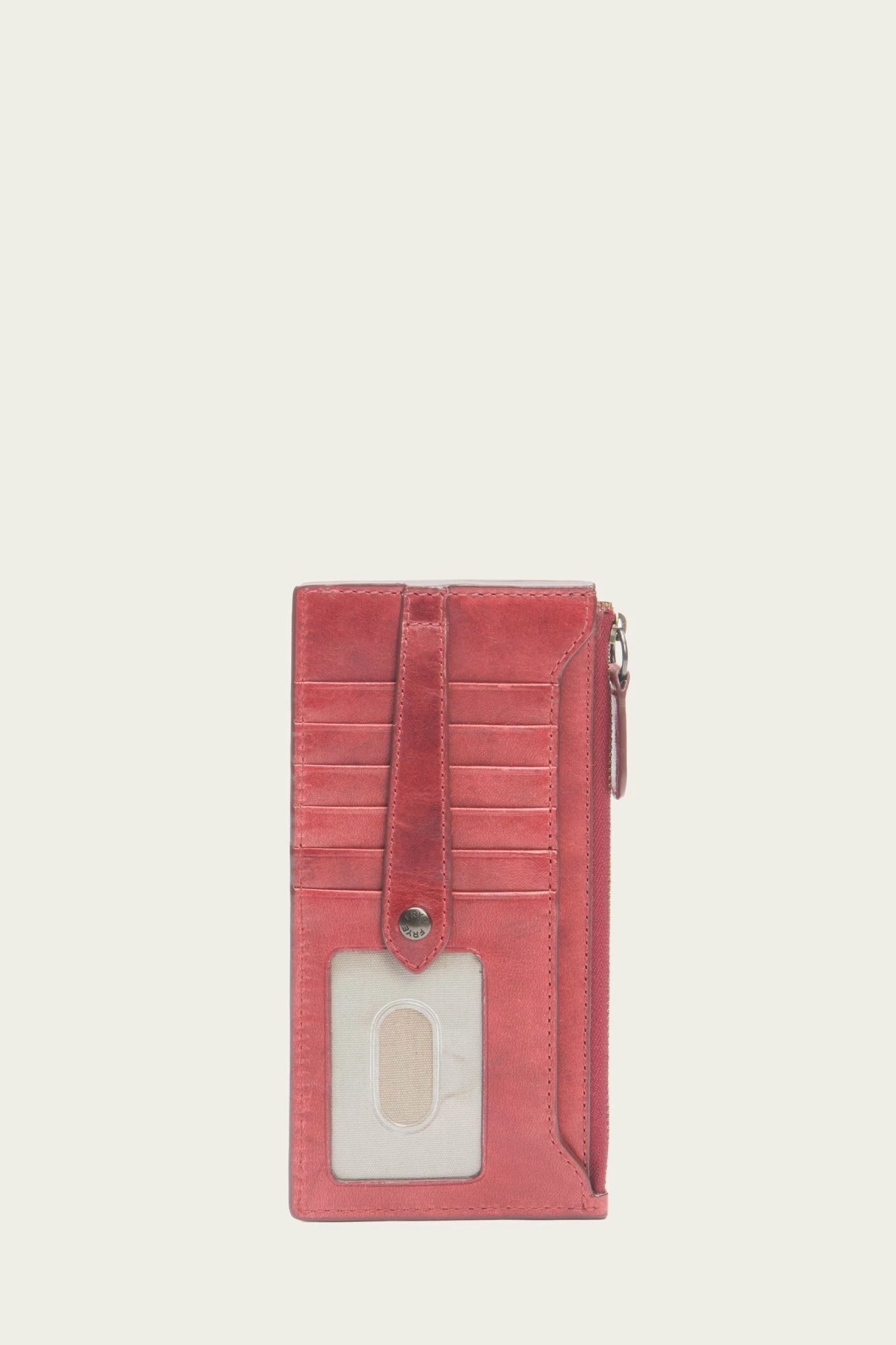 – 9 card slots, clear ID thumb slot, 1 slip pocket, 1 zip pocket
