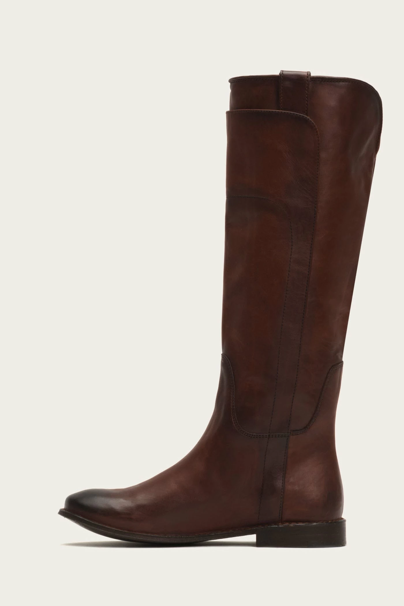 These tall stitched-out detailed riding boots are sophisticated and sleek. This square-toe pair is made from a smooth vintage Italian leather and has a low heel. The pull tabs at side are easy for wearibility. – Italian leather